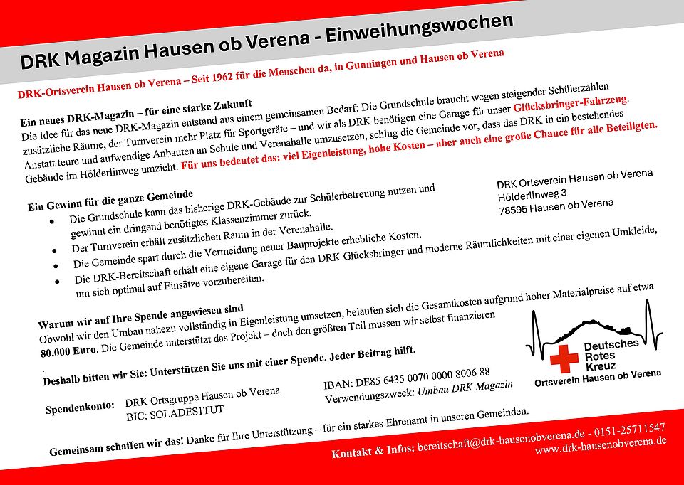 Unsere Mitglieder setzen sich für die Bürgerinnen und Bürger der Gemeinden Gunningen und Hausen ob Verena sowie für alle Menschen in der Region ein. Unser Engagement umfasst vor allem den Sanitätsdienst, Betreuungsdienst, Blutspenden, den Glücksbringer, Helfer vor Ort, Jugendarbeit, DRK-Gesundheitsprogramme, den sozialen Bereich sowie die humanitäre Hilfe und den Katastrophenschutz.