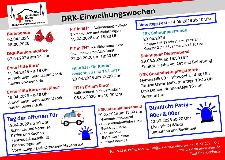 Die DRK-Bereitschaft Hausen ob Verena blickt auf eine lange Tradition zurück. Seit 1962 engagieren sich Menschen in und um Hausen ob Verena für das Deutsche Rote Kreuz. Derzeit zählt unsere Bereitschaft 21 Mitglieder, 16 freie Mitarbeiter und über 25 Jugendrotkreuzler. Unsere Arbeit wird von etwa 50 Fördermitgliedern unterstützt.